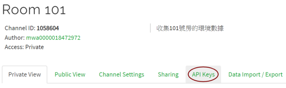 例如我們想把光亮度發佈到Room 101, 需先到該Channel 頁面, 再進入API Keys頁面
