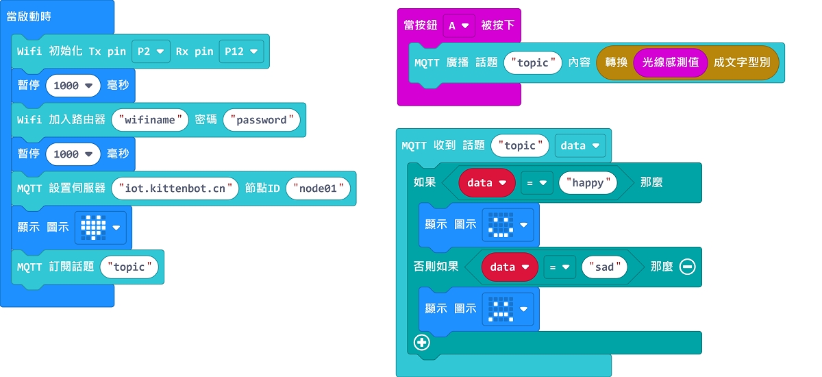 組合出以下程式,並填入自己的Wifi資料和話題名稱。
